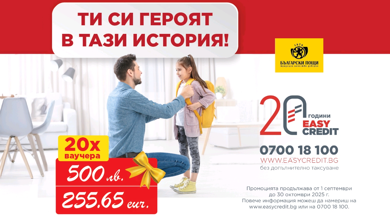 „Изи Кредит“ обяви старта на своята нова есенна промоция под вдъхновяващото мото „Ти си героят в тази история“. Кампанията, която ще се проведе от 1 септември до 30 октомври 2025 г., дава възможност на 20 късметлии да спечелят ваучер на стойност 500,00 лв. (255.65 евро) всеки, като участник може да спечели само един брой от посочената награда.